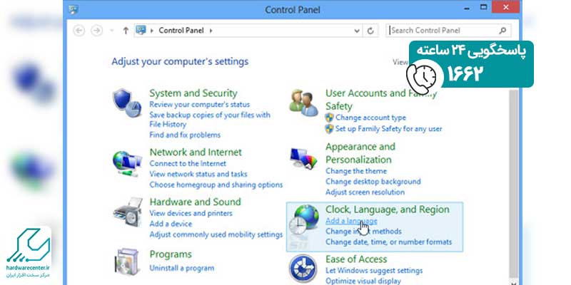 - برای تغییر زبان لپ تاپ ایسوس از طریق کیبورد نیز به بخش Control Panel سیستم مراجعه نمایید. سپس در پنجره کنترل پنل و از بخش Clock, Language, and Region